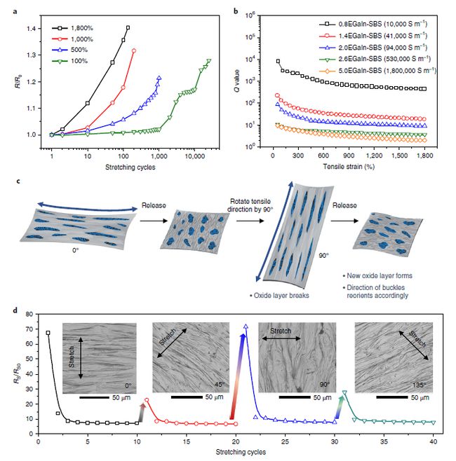 EGaIn-SBS的超高拉伸性和電穩(wěn)定性主要歸因于液態(tài)金屬,形成了橫向網(wǎng)狀和褶皺結構。這種結構是在預拉伸活化步驟中自形成的。在拉伸過程中,初始的EGaIn膜破裂成網(wǎng)狀結構,在新的表面重新形成了新的氧化層。由于氧化層比液態(tài)金屬要硬得多,因此當襯底緩慢恢復到0%應變時,較硬的上層氧化物層和較軟的下層襯底之間的機械競爭導致了EGaIn彎曲起皺。在12個預拉伸循環(huán)后,每個循環(huán)中的電阻和Q值(品質(zhì)因數(shù),材料應變與材料阻值變化的比)的變化都達到了穩(wěn)定階段,表明起皺的網(wǎng)狀結構已達到可逆狀態(tài)。