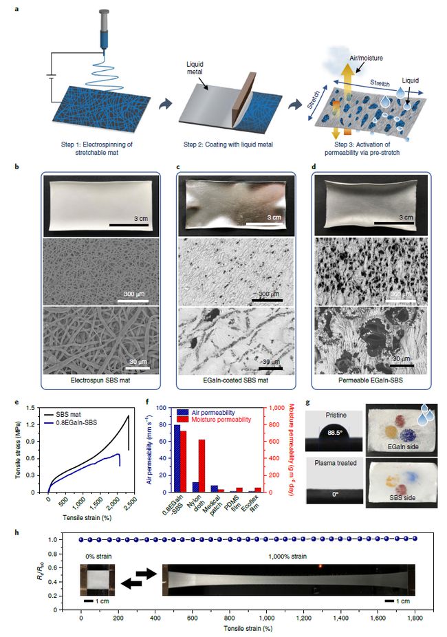 液態(tài)金屬纖維氈的制備主要有三個步驟:(1)超彈性纖維氈(poly(styrene-block-butadiene-block-styrene),SBS)的靜電紡絲;(2)在可拉伸氈上涂覆液態(tài)金屬EGaIn;(3)通過預拉伸激活滲透性。剛涂覆液態(tài)金屬EGaIn的彈性纖維氈SBS表現(xiàn)出類似金屬的光澤,幾乎不具有滲透性,將基底拉伸至1800%應變,反復循環(huán)12次后,基底顏色變暗,EGaIn轉(zhuǎn)變?yōu)閼覓煸赟BS微纖維之間的網(wǎng)狀多孔結構,EGaIn-SBS的透氣性超過了商業(yè)化的尼龍布和醫(yī)用貼片,初始電導率約10000 S m-1, 即使處于1800%的拉伸應變下,電阻變化也僅為4.1%。