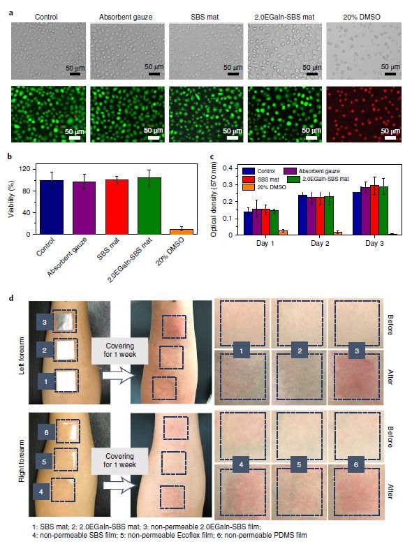 進一步的,作者使用L-929細胞作為模型細胞,探究了EGaIn-SBS的生物相容性。定量分析顯示,測試組的細胞活力在24小時之后仍保持在95%左右,沒有明顯證據(jù)表明EGaIn-具有毒性。在兔子和人類皮膚上的進一步測試表明,EGaIn-SBS的透氣性良好,即使佩戴一周也不會對皮膚造成任何負面影響(紅腫等)。