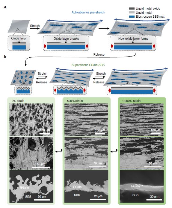 近日,香港理工大學鄭子劍課題組報道了一種可拉伸導體——“液態(tài)金屬纖維氈”(liquid-metal fibre mat,LMFM),該導體通過將液態(tài)金屬簡單涂覆或印刷到靜電紡彈性纖維氈上而制成。懸掛在彈性纖維之間的液態(tài)金屬會自組織成橫向網(wǎng)狀和垂直彎曲的結構,同時提供高滲透性,可拉伸性,電導率和電穩(wěn)定性。此外,液態(tài)金屬纖維氈具有良好的生物相容性,對超過1800%應變的全向拉伸具有很好的適應性。