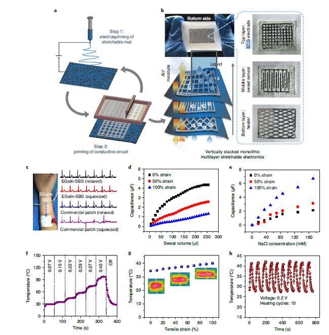 EGaIn-SBS的增材制造原理和自適應超彈性為通過印刷制造可拉伸電子產(chǎn)品提供了極好的平臺?;谠摴に嚨腖ED陣列能夠承受500%的應變和720°的扭曲,并能夠在水下工作。即使對其進行120分鐘的清洗,也不會影響LED陣列的性能。通過重復的靜電紡絲和印刷工藝,還可以制造垂直堆疊的多層電路,提供具有出色的佩戴舒適性和多功能性的新型的整體可拉伸電子產(chǎn)品。作者制備了三層印刷電路的可拉伸電子氈,分別用作生理信號傳感(頂層)、汗液傳感(中間層)和加熱(底層),實現(xiàn)了對人體生理狀態(tài)和電熱療法的多通道監(jiān)測。包括拉伸、壓縮狀態(tài)下對生理信號的監(jiān)測,汗液中溶質(zhì)濃度的監(jiān)測以及表面溫度的調(diào)節(jié)等(30-90℃)。