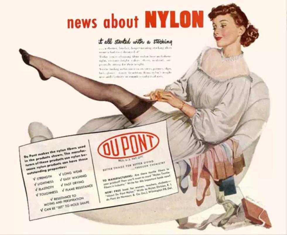 1939年10目24日杜邦在總部所在地公開銷售尼龍絲長襪時(shí)引起轟動(dòng),被視為珍奇之物爭相搶購。