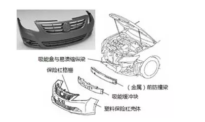 通常所說的塑料汽車保險杠,其實(shí)只是真正意義上的保險杠的一部分。以汽車前保險杠為例,真正的汽車保險杠主要由塑料殼體(也稱保險杠蒙皮,前保險杠上面通常嵌裝有格柵)、吸能緩沖塊(主要為泡沫)和防撞梁(也稱橫梁)等三部分組成。