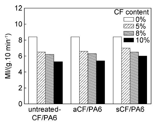 圖4 不同處理方法CF增強的復(fù)合材料的熔融指數(shù)對比