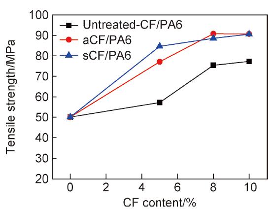 圖3是不同纖維含量的CF/PA6復(fù)合材料的拉伸強度曲線。改性處理后的aCF,sCF復(fù)合材料的拉伸強度均較原始CF有大幅提升;且隨著aCF,sCF添加比例的增加,復(fù)合材料的強度呈逐漸升高的趨勢。當纖維添加比例為5%時, sCF復(fù)合材料強度高于aCF;但當纖維含量進一步增加到8%時,aCF的強度反而略高;當含量達到10%時,二者強度趨于一致。這是由于在纖維含量較低時,纖維與基體的結(jié)合能力對復(fù)合材料強度的影響占主導(dǎo)地位,改性處理后的CF與PA6基體結(jié)合力更好,且sCF的結(jié)合力優(yōu)于aCF;隨著纖維含量的增加,CF對PA6的補強效果逐漸達到極限,因此,在纖維含量較高時,不同的CF改性處理方法對復(fù)合材料的補強效果趨于一致。