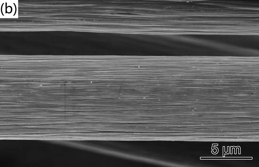圖1是原始CF、酸化處理后的CF(aCF)、上漿處理后的CF(sCF)的SEM照片??梢钥闯觯糃F(圖1(a))表面具有沿纖維軸向排列的溝槽。經(jīng)酸化處理后的aCF(圖1(b))表面粗糙度增加,縱向溝槽更加明顯。上漿處理后的sCF(圖1(c))除了沿纖維軸向的溝槽外,纖維表面還出現(xiàn)了大量褶皺,這表明經(jīng)上漿處理后,纖維表面包覆了一層連續(xù)的PA6薄膜覆蓋層。