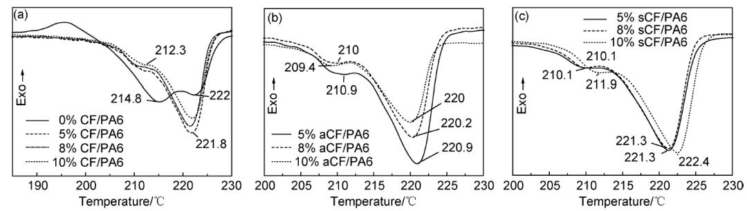 圖6是不同方法處理的CF/PA6復(fù)合材料的降溫結(jié)晶曲線。純PA6結(jié)晶峰溫度為161.7 ℃,加入不同比例CF后,其結(jié)晶峰向高溫方向移動,峰變窄,這表明復(fù)合材料內(nèi)部晶片變厚且均勻;結(jié)晶溫度區(qū)間大幅減小,說明加入CF后,大大促進了PA6的結(jié)晶速率,且使其結(jié)晶更加均勻、完善。經(jīng)過改性處理后的aCF,sCF復(fù)合材料(圖6(b),(c))則獲得更高的結(jié)晶溫度,未處理CF/PA6的結(jié)晶溫度約為180 ℃, aCF/PA6結(jié)晶溫度范圍在181~182 ℃,sCF/PA6的結(jié)晶溫度范圍達181~185 ℃。